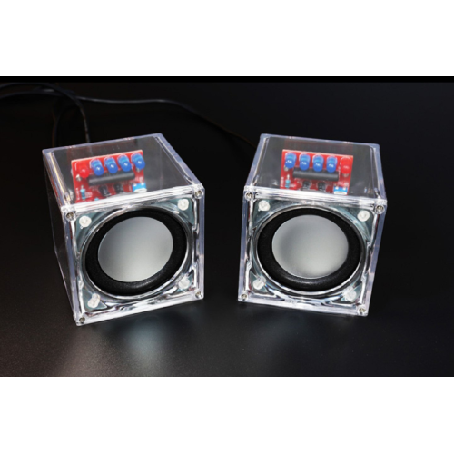 Dual Channel DIY Transparent Mini Amplifier Speaker Kit 65x65x70mm 3W Per Channel Feature: Installation: Circuit board assembly welding Speaker power: 3W per channel Case Size: 65 x 65 x 70mm (W / H / D) Function: With LED music spectrum display Weight: 410g Package included: 1 x DIY Mini Speaker Kit